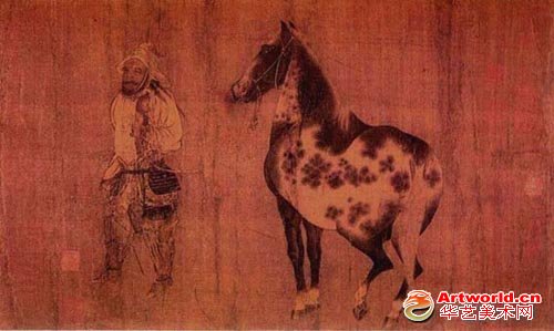 南唐画家,后主时期的画院学生。其作品《调马图》(上海博物馆藏)画面作一马夫待行状,气息浑厚质实,虽然由于年深日久,绢色黯敝破损,但依然可经看到它当年的艳丽典雅的色彩霞,人物虽极简单,但人物和骏马神态,跃然于绢素之上。《江行初雪图》(台北故宫博物院藏)全卷描写长江沿岸渔村初雪情景。表现出江南初冬渔民和行旅的生活情况。绘景画人均极传神,图中树石笔法老硬,水纹用笔尖劲流利,天空用白粉弹作小雪,表现出雪花的轻盈飞舞。 赵干:《调马图》(上海博物馆藏)