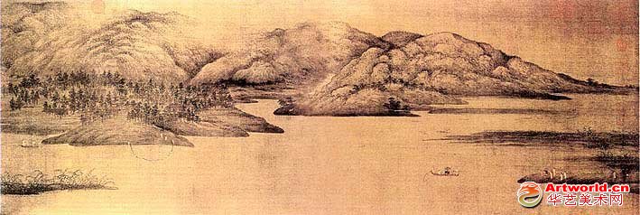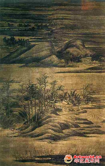 字叔达,江南钟陵人,在南唐做过后苑副使。后苑在宫廷的北面,故称董北苑。他的山水水墨学王维、着色学李思训。秋岚远景,多写江南风景。山色苍郁,枝干劲挺,小树点缀而成,墨气淋漓,作《落照图》,用笔草草,近视殊不显,远视则村落、山峦清晰,宛如夕照之色,这种明暗透视画法,比西洋要早近千年。 董源的山水题材取自江南实景,如他的《潇湘图》(现藏故宫博物院),描绘了远山茂林,江水行船,沙滩平坡,芦汀沙洲、是典型的江南风光。他的《龙袖骄民图》,描绘了草木茂盛的丘陵,显得空气温润,阳光一片,具有真实感。他的“披麻皴”画法,对后世影响很大。 www.Artworld.cn