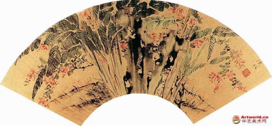 本文来自华艺美术世界网 【名称】明 陈栝 芭蕉紫薇图 此图画池塘浅水中,一丛菖蒲挺立如剑,蒲叶上停落着一只蝴蝶。造型单纯朴拙,笔墨粗简凝重,构图新颖大胆。菖蒲放在画面中间,用粗笔淡墨挥写,苍健而有变化,很好地表现了其挺拔、厚韧的质感。画蝴蝶使用细笔浓墨,勾染相合,比较工致。菖蒲与蝴蝶,一粗一细,一淡一浓,对比之下别有情趣。其他作为陪衬的花草坡石,亦剪裁大胆,处理得当。 copyright Artworld.cn