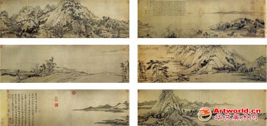 元 黄公望,纸本 设色,纵33cm,横636.9cm。黄公望,字子久,号一峰,大凝道人,擅长画山水,多描写江南自然景物,以水墨,浅绛风格为主,与吴镇,王蒙,倪瓒并称元四家。 华艺美术世界网