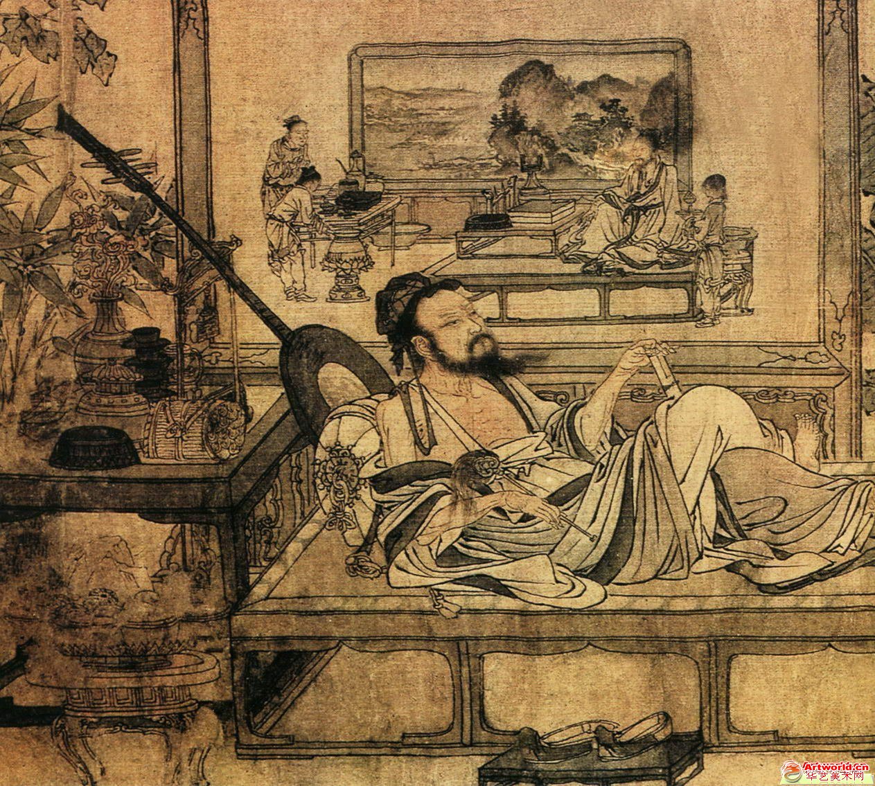 刘贯道 (约1258-1336年)中国元代画家。字仲贤,中山(今河北定州)人。家贫性聪慧,自学成才。曾任御衣局使。擅道释、人物、山水、花竹、鸟兽,道释、人物师承晋、唐,笔法工细,色彩浓丽,形象真实生动;山水学郭熙,花鸟遍师历代诸家。其画笔法凝练,坚实有力,造型准确,生动传神。 传世作品《忽必烈出猎图》,绢本,设色,画中忽必烈穿白裘跨青鬃马,从者九人,猎于广漠,图录于《故宫名画三百种》;《积雪图》轴,绢本,水墨山水,图录于《故宫书画集》;《消夏图》卷,绢本,设色,为元画中上乘之作,藏故宫博物院;《梦蝶图》卷,绢本,设色,纵30厘米,横65厘米,藏美国王己千先生怀云楼。 ![]() ![]() 【名称】元 刘贯道 消夏图 copyright Artworld.cn 【年代】元代 【简介】绢本设色,纵29.3厘米,横71.2厘米,美国纳尔逊·艾特金斯艺术博物馆藏。 此图绘一文士赤裸上身卧于榻上,右手持尘尾,左手拈书卷作思考状。后斜置一琴,榻后方桌上陈书卷、砚台、茶盏之属,点名画中主人的生活情趣。榻旁为一屏风,画幅另一侧绘仕女二人相对而语。人物衣纹爽劲流畅,起止转折略有顿挫,具宋代人物画风格,而与其《元世祖出猎图》的画风有所不同。刘贯道山水作品不存,重屏中的山水画是我们管窥其山水画风貌的唯一资料。作者署「□道」二字款于竹枝空隙处,隐讳不易辨,清高士奇《江村书画目》即误定为刘松年的作品。拖尾有明虞谦诗跋,卷中分别钤有清怡亲王、安岐,今人王季遷等鉴藏印。《江村书画目》著录。 (责任编辑:子牛) 转载请注明:华艺美术网 » 元 刘贯道《消夏图》 |
