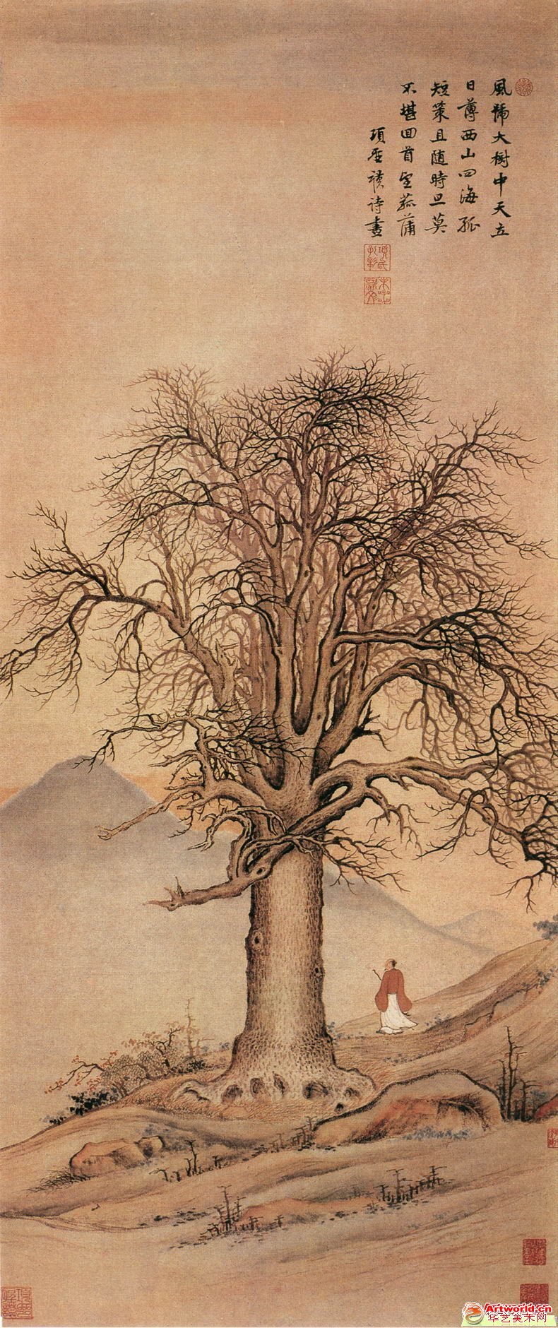 项圣谟(1597-1658),明末清初画家,初字逸,后字孔彰,号易庵,别号胥山樵、逸叟等,浙江嘉兴人。祖父项元汴,为明末著名书画收藏家和画家。伯父项德新也善画。他受家庭环境熏染,从小喜爱绘画,才华早露。项圣谟善画山水、人物、花卉,尤以山水见长,不受当时各种流派的影响,而于自己的家藏中,直接向古人学习,广泛地吸收前人的创作经验,山水画融汇了宋人用笔的周密严谨和元人的韵致,笔法秀逸,布局大开大合,富于变化,特别对乔木的刻画,寓巧于拙,形象鲜明强烈。尤喜画松树,有“项松之名满东南”之誉。 项圣谟曾由秀才而被荐入国子监为太学生。崇祯元年(1628)被召入宫廷,为天子绘九章法服。他对明代晚期官场的腐朽黑暗甚为不满,不久即回到家乡,与董其昌、陈继儒、僧智弦及他的妻伯李日华等前辈以诗画相往来。项圣谟对当时人民的疾苦十分同情,有《甲子夏水图》、《乙丑秋旱图》、《六月鸣风竹图》、《群雀稻蟹图》等诗画作品,记录了当时人民遭受自然灾害的艰难困苦生活,尖锐地批评、揭露了官僚豪绅对农民的层层盘剥。他非常关心国家和民族的安危,明王朝覆灭后,顺治二年(1645)清兵大举南侵,于农历闰六月二十六日攻破嘉兴府城,项圣谟背负老母携带妻子逃难。所有祖父所遗下的大批古代法书名画等文物,有的毁于战火,有的为清兵所掠,国破家亡,使他痛不欲生,从此以后,将满腔悲愤,寄托于诗画创作。著名的《大树风号图》,寄托了他对故国江山深切的怀念和无限的哀思。《天寒有鹤守梅花图》表明了他坚贞不屈的心志。作品自明亡以后,不再署以王朝年号纪年。清顺治十一至十二年(1654-1655),他曾到福建旅行,创作有《闽游图》。顺治十四年又到苏州旅行,次年病逝于家。有《朗云堂集》、《清河草堂集》传世。 本文来自华艺美术世界网 ![]() 【名称】明 项圣谟 大树风号图 【年代】明代 【简介】图轴,纸本,设色,纵:115.4cm,横:50.4cm。现藏台北故宫博物院。 此图是一幅寓意怀念故国的人物画,是项圣谟在明王朝灭亡以后创作的,表达了他对故国的怀念和寄托着深沉的哀思。图中近处陂陀上古树一株,参天独立,树下一老人携杖背向而立,仰首遥望远处青山和落日余晖,徘徊行吟,似不忍离去。图右上作者自题七言绝句一首:“风号大树中天立,日薄西山四海孤。短策且随同旦莫(同暮),不堪回首望菰蒲。”古树的形象塑造鲜明独特,背景简炼空旷,像是阅尽沧桑,饱经风雨,树叶虽经霜雪的摧残,飘零罄尽,但是却傲然挺立,有一种不可屈服的内在精神。整个画面包括诗题,给人一种沉郁、悲愤、孤寂、苍凉之感。 www.Artworld.cn (责任编辑:子牛) 转载请注明:华艺美术网 » 明 项圣谟《大树风号图》 |