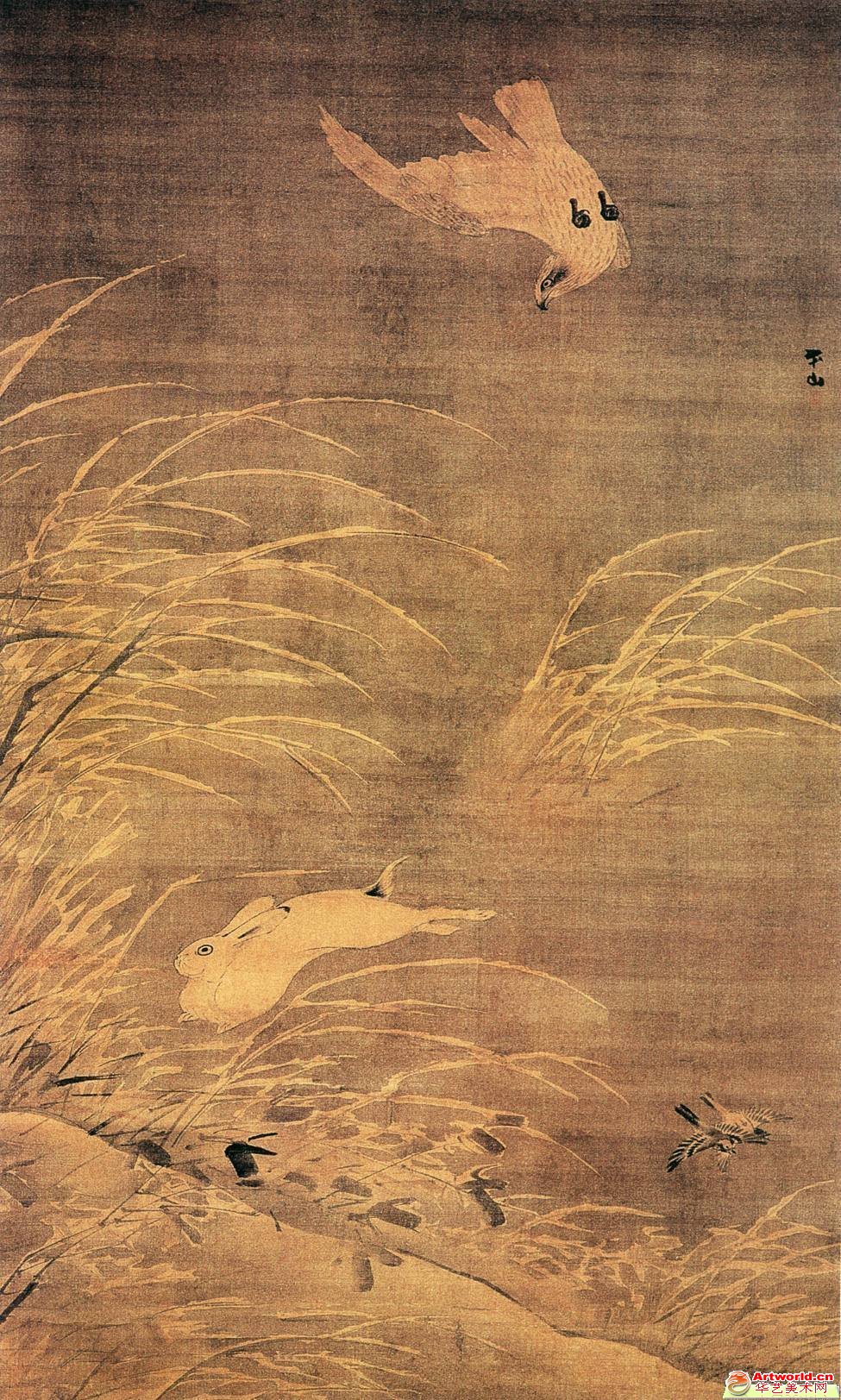 张路(1464-1538),字天驰,号平山,仅以字行于世,祥符(今河南开封)人。擅山水、人物,行笔劲峻顿挫,力可扛鼎。少年聪慧,见吴道子、戴进所画人物,临摹肖其神,以画成名,是明代追随戴进、吴伟的重要浙派画家,在人物上师法吴伟,但秀逸不足,狂放过之,山水上有戴进的风致。张路的绘画艺术很受世人赞誉,明朝詹景风就盛赞他“足当名家”。在当时,缙绅们咸加推重,得其真迹,如若拱壁。 传世画作有《山雨欲来图》、《山水人物图》、《溪山泛艇图》、《吹萧女仙图》、《苍鹰攫兔图》等。 ![]() 【年代】明代 【简介】绢本,设色,纵158厘米,横97厘米。南京博物院藏。 图绘一只苍鹰凌空虎视,欲俯冲攫兔,白兔仓皇飞奔,力图逃脱厄运。西风凛冽,芦草在疾风中摇曳。鹊雀闻声驚飞,长鸣不止。全图结构紧张,虚实相宜,笔墨遒劲秀逸,给人一种紧张险恶、阴冷悲壮之感。作者以娴熟的笔调,细致的刻画,表达了禽兽的不同神态。署款“平山”,钤“张路”朱文方印。 (责任编辑:Ivan S) 转载请注明:华艺美术网 » 明 张路《苍鹰逐兔图》 |