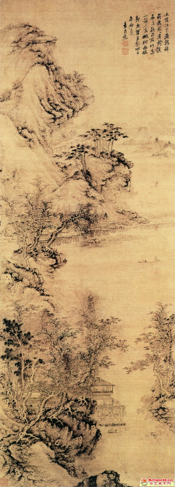 袁尚统,生于1570年,卒年不详,明代画家。字叔明,吴(今江苏苏州)人。善画山水、人物、花鸟,山水苍润浑厚,意境宏远;喜绘风俗题材,重情节描写,富生活气息人物多为普通百姓,笔墨超逸奔放,颇得宋人笔意,独具自家风格。 传世作品有明崇祯十七年(1644)作《远溪秋兴图》轴、清顺治三年(1646)作《晓关舟挤图》轴、康熙五年(1666)作《桃园洞天图》扇页,现藏故宫博物院;崇祯十六年作《古木群乌图》轴、顺治十八年(1661)作《枯水寒鸦图》轴(作此轮时年七十二,上有金俊明(1 602-1675)题诗),该两画均藏上海博物馆;《泰山松色图》轴藏沈阳故宫博物院;崇祯九年(1636)作《维扬古渡图》轴、顺治八年(1651)作《寒鸦图》轴、九年作《古木栖身图》轴、《洞庭风浪图》轴藏南京博物院;崇祯八年(1635)作《寒江独钓图》轴藏山东省博物馆;崇祯九年(1636)作《归人争渡图》轴藏旅顺博物馆;顺治三年作《迎春图》轴藏苏州市博物馆;康熙四年(1665)作《枯林孤棹图》轴藏常熟市博物馆。 内容来自A r t w o r l d . c n ![]() 【年代】明代 【简介】水墨,淡设色,横58厘米,纵162厘米。(日)私人藏。 此图画峰峦起伏的寒江之滨,疏林槎、蚜,掩映水榭。烟波浩渺处,归雁影稀。境界静谧清远。自题称仿郭熙笔法而作此力,然则山石峰峦的扭曲势态及简逸的皴笔,却独具个性。 (责任编辑:Ivan S) 转载请注明:华艺美术网 » 明 袁尚统《江寒雁影图》 |