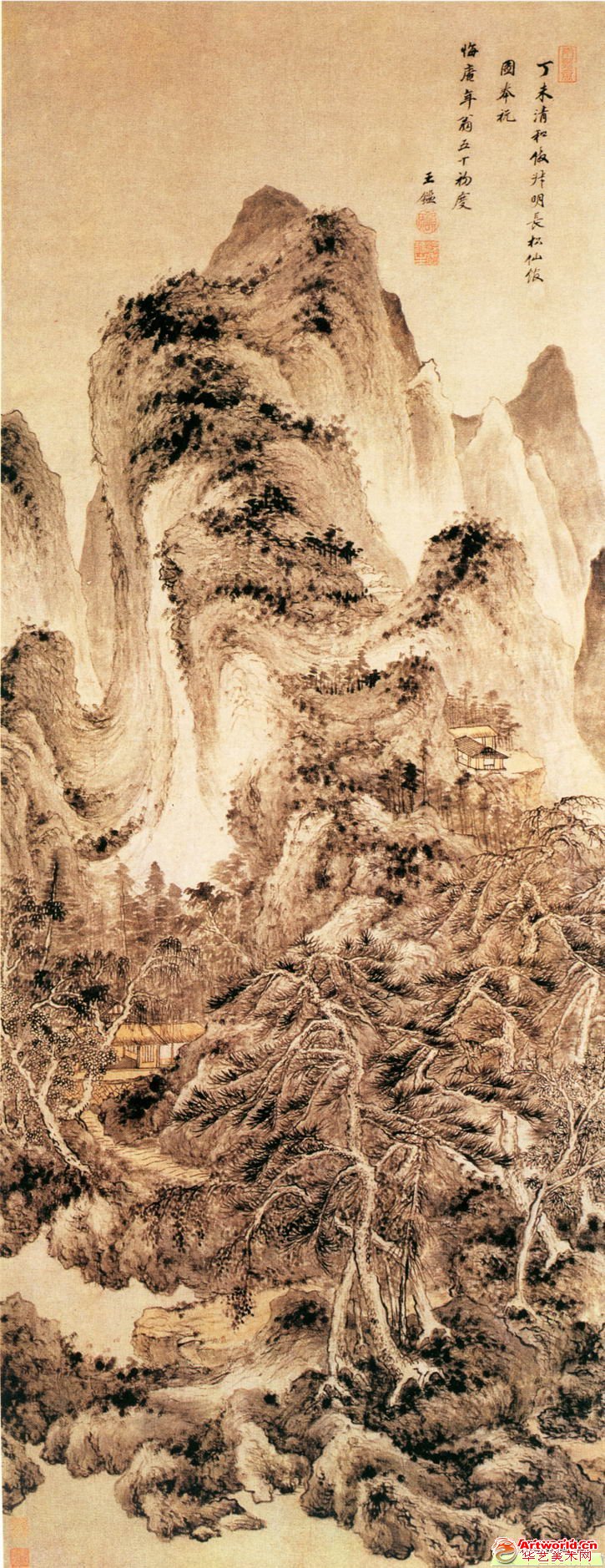 王鉴 (1598-1677)清代著名画家。字元照,一字圆照,号湘碧,又号香庵主。江苏太仓人。崇祯六年(公元1633年)举人。后仕至廉州太守,故又称“王廉州”。王世贞孙。家藏古今名迹甚富,摹古工力很深,笔法非凡。为“清初六家”之一。擅长山水,远法董(源)、巨(然),近宗王蒙、黄公望。运笔出锋,用墨浓润,树木丛郁,后壑深邃,皴法爽朗空灵,匠心渲染,有沉雄古逸之长。间作青绿重色,亦能妍丽融洽。信云林山水意极绵密。仿山樵山水,仿赵大年《春景》没骨山水、仿洪谷子设色山水,疏密奇正,纯以篆法写轮廓。仿子久《秋木山色图’》、《仿黄公望烟浮远岫图》、摹沈石田山水、仿董源《秋山图》仿范华设色山水、仿巨然山水,骨重气轻。其作品大多摹古,信效名家,缺乏独创,并具有浓厚的复古思想和形式主义画风。其著述有《染香庵集》、《染香庵画跋》。 本文来自华艺美术世界网 ![]() 【名称】清 王鉴 长松仙馆图 【年代】清代 【简介】纸本设色,纵 138.2厘米,横 54.5 厘米。故宫博物院藏。 此图仿王蒙名作《长松仙馆图》,笔法全学王蒙,构景幽深。笔墨苍莽淹润,大胜其晚岁一般尖秀用笔的作品,是画家晚年的杰出作品。自识“丁未清和仿叔明长松仙馆图,奉祝悔庵年翁五十初度。王鑑”。钤“雨新斋”、“圆照”朱文印,“染香庵主”白文印。按丁未为康熙六年,公元一六六七年,作者时年七十岁。上款“悔庵”为尤侗,字同人,号悔庵,江苏苏州人。顺治五年拔贡,薦鸿博,授检讨,官侍读,善法书。“丁未”年恰是尤侗五十岁。 (责任编辑:子牛) 转载请注明:华艺美术网 » 清 王鉴《长松仙馆图》 |