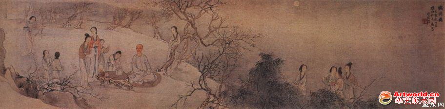 费丹旭(1801—1850),字子苕,号晓楼、环溪生、偶翁、环渚生、三碑乡人,乌程(今浙江吴兴)人。擅画人物、花卉,尤精仕女。其山水画,清灵雅淡。所作肖像,“如镜取影,无不曲肖”。传世作品有《东轩吟社图》、《纨扇倚秋图》、《仕女图》、《姚燮忏绮图》、《月下吹箫图》等。 ![]() ![]() 【名称】清 费丹旭 姚燮忏绮图 【年代】清代 【简介】卷,纸本,设色,纵31厘米,横128.6厘米。北京故宫博物院藏。 姚燮,是清代后期的诗人和画家,字梅伯,号复庄,又号大梅山民。此图是描绘姚燮与家中诸侍姬真实的生活情景。画中姚燮端坐于蒲团之上,怡然微笑似有所悟,身边诸姬环绕,或解书囊,或铺帛纸,或轻声对语,或倚树观望,或正结伴赶来,神形各异,仪态万千。加之空中明月高悬,夜色如水,桃林烟弥雾漫,竹林枝叶萧萧,构成一幅清逸出尘的画面。作者对姚燮面部细加渲染,有肖像写实效果,而其他人物则是以作者一贯的纤弱美女的形象写出,设色清淡,面目雷同,只在衣着发饰之上有所变化。 本文来自华艺美术世界网 此图名为“忏绮”,是指姚燮对生活的感悟和对虚度年华的忏悔之意,旨在刻画“罗绮丛中悟此身”的禅学意境以及“鬓丝禅榻心暗伤,年华似水不可恃”的感触。但从画面来讲,不过是士大夫阶层一个生活场景的描绘而已。 (责任编辑:子牛) 转载请注明:华艺美术网 » 清 费丹旭《姚燮忏绮图》 |