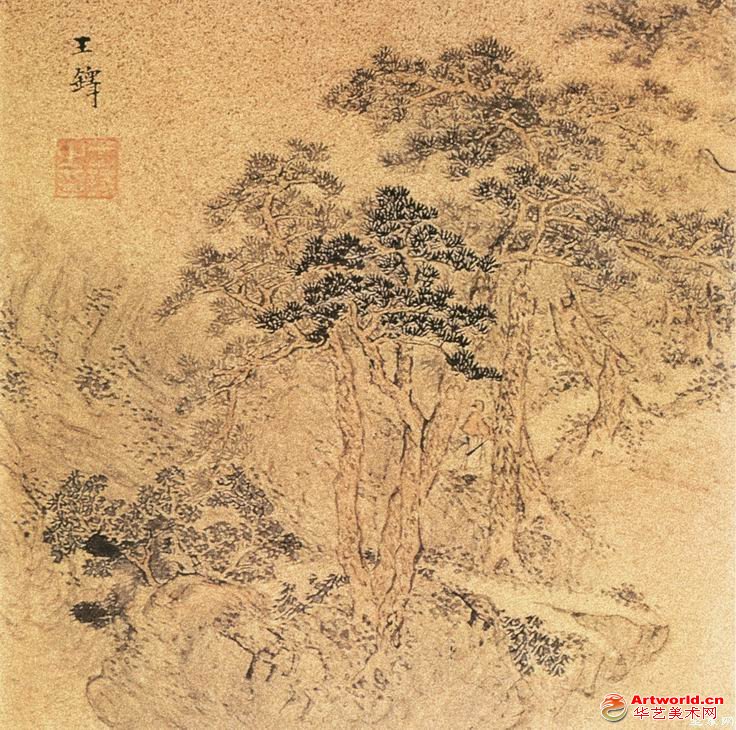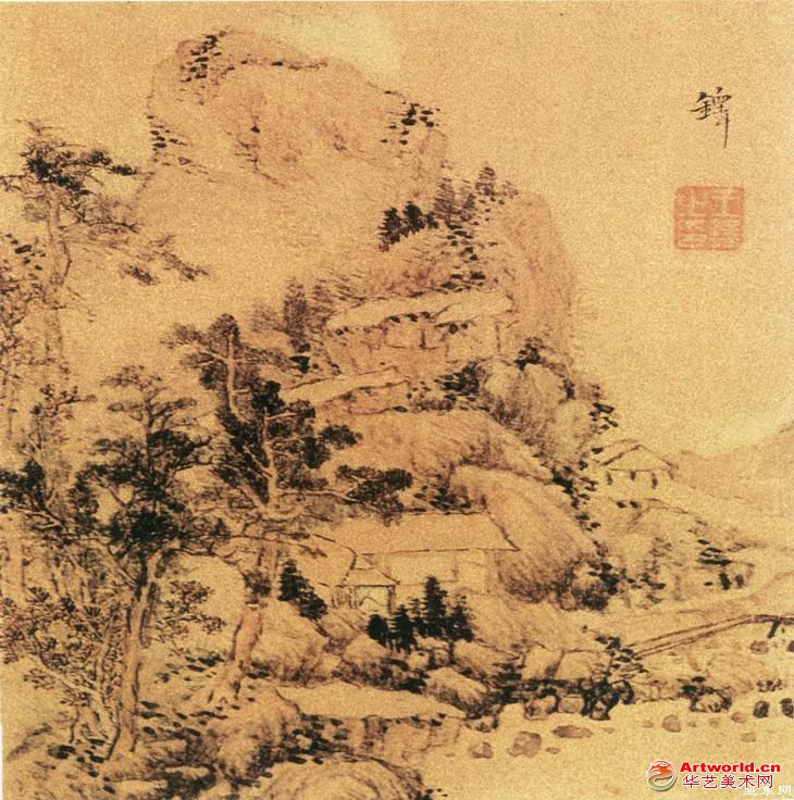 山水图 王铎 册页 洒余笺 设 色 纵20厘米 横20厘米 辽宁省博物馆藏 王铎(1592—1652)明末清初画家。宇觉斯,号十樵,又号痴仙道人,河南孟津人。明天启二年(1622)进士。入清官至礼部尚书。工诗、古文和行草书。山水宗荆关。亦善画梅竹、兰石,别成一格。山水图之一《十里松荫图》。画平冈高松,疏落有致,松针繁茂一笔不苟,风格苍秀,意境深遂,清新之气袭人。画家运用笔墨的微妙变化,使画面层次分明、结构严谨,富于变化,设色幽清有致,和谐自然。山水图之二《深山幽居图》。画林峦深壑,草阁藏溪涧之滨,山径迂回,书斋寂静,用苍劲明快的笔墨,勾画出一幅山林隐居景象。构图简净,意境清远,充分显示了作者对自然界入微的观察和驾驭笔墨的高超技艺。 (责任编辑:子牛) 转载请注明:华艺美术网 » 王铎《山水图》 册页 选二 |