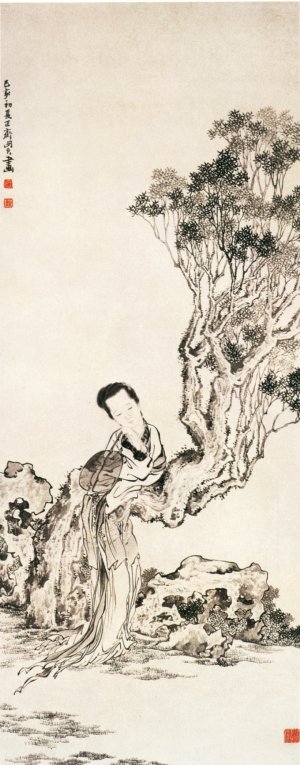纨扇仕女图 闵贞 立轴纸本墨笔纵113.8厘米横45.9厘米 上海博物馆藏 此图仕女神态娇弱,流露出一种夏日 疲困的气息。树干的苍老虬蟠与女子的妩 媚身姿,曲线交叉,相映相称,构成...