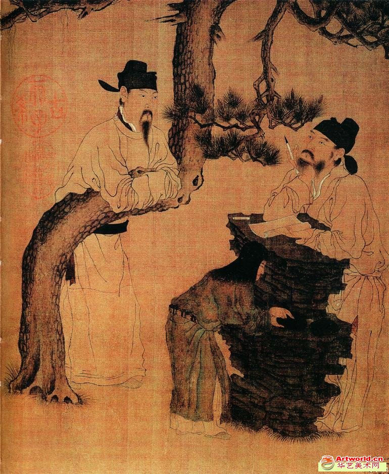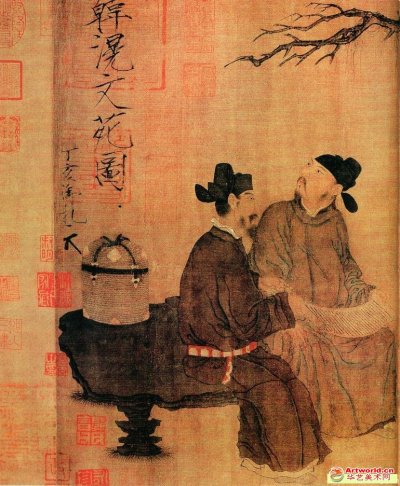 周文矩,句容(今属江苏)人。曾在南唐后主李煜时任画院翰林待诏。工冕服、车器、人物、仕女,多以宫廷或文人生活为题,以"“用意深远”著称。其仕女画师从周昉,作风更加纤丽繁复,用笔多以“战笔”为特点。现藏故宫博物院的《重屏会棋图》是他的传世作品之一,描绘南唐中主李璟与兄弟们在屏风前对弈的场面。因背景屏风上又画屏风,所以称为“重屏”,该图无名款,宋元藏印均伪,但人物服饰及生活用品为五代遗制,至少可以反映周文矩画法的面貌。藏于美国弗利尔博物馆的《琉璃堂人物图》卷为清人摹本,该画描绘盛唐诗人王昌龄与其诗友李白、高适等人在江宁琉璃堂唱和的故事。宋徽宗误题为韩滉《文苑图》的传本其实是该画的一部分。《宫中图》一画为南宋摹本,记载说为周文矩真迹临本。 中国星翁艺苑 ![]() 【名称】五代 周文矩 文苑图 【年代】五代 【简介】卷,绢本,设色,纵31.3厘米,横58.5厘米。北京故宫博物院藏。 这件作品以前被认为是唐代韩滉作,根据是画上有宋徽宗赵佶题“韩滉文苑图”及“天下一人”押宇等。但据今人考证,此图乃五代周文矩《琉璃堂人物图》的后半部。画中精心描绘了李白等四位文人运思觅句的生动情态。最右边的托腮握管,另一手轻捧纸绢,似有所悟却又随即陷入沉思。他的对面,是一童子在俯身研墨。画面中部有一株弯曲的松树,另一构思者双手插入袖管,伏在松干上凝思,那神气好像完全忘记了周围的一切,连眼珠也不转动了似的。左边两个人都坐着,共展一卷文章阅读,其中一位忽然扭头回视,若有所闻;另一位作沉思状。画家驾驭人物性格、再现特定情境的功力在这一作品中得到了充分的表现。全画着色沉着淡雅,勾线坚凝而多折,是周文矩的“战笔”画法。五个人物姿态各不相同,并在变化错落中达到了和谐统一。此图可与《琉璃堂人物图》一起欣赏。 copyright Artworld.cn (责任编辑:子牛) 转载请注明:华艺美术网 » 五代 周文矩《文苑图》 |