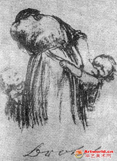 作品描写的是第一次世界大战后德国儿童与妇女饥饿形象的一个侧面,因为没有面包,两个饥饿的孩子拉扯着母亲的衣服在啼哭,无可奈何的母亲留给我们的只是一个背影,但仍无法掩盖内心难以抑制的悲痛感情,只用了简练的几笔,但处在生活重压下苦难而伟大的母性形象已跃然在眼前。作品没有烦琐的线条,也没有色彩的渲染,但每根线条都蕴含着强烈的爱憎和情感,在黑白世界里囊括了感人肺腑的力量。 内容来自A r t w o r l d . c n