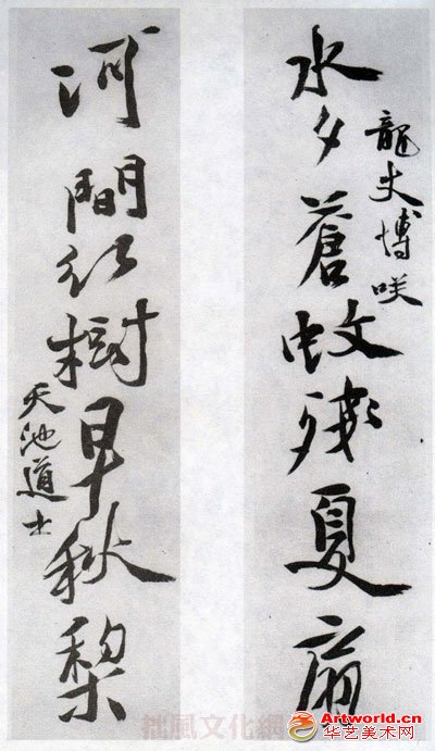 人生的不幸固是痛楚而悲怆,但也正是如此,才造就了徐渭在艺术方面的卓绝表现及杰山成就。艺术作为徐渭情感宣泄及升华的载体,其不羁的性格、狂狷的才情及散漫而无所顾忌的人生道路,给了徐渭的最大的自由空间,故其诗、文、书、画皆匠心独运,直抒胸臆、追求性灵、表现真情。 徐渭自称:“吾书第一、诗二、文三、画四。”(陶望龄《徐文长传》)可见对其书法的自许及钟情。袁宏道云:“(徐)不论书法而论书神,诚八法之散圣,字林之侠客也。”诚然,作为一时才人、一时狂士的徐渭是绝不会为法所缚的,即使是学书道路的起点——临摹古人书法,徐渭也要有自我,不肯屈膝于古人。其《书季子微所藏摹本兰亭》云:“非特字也,世间事,凡临摹直寄兴耳,铢而较,才而合,忌真我面目哉?”并主张“取诸其意气而已”。徐渭学书,曾浸淫于宋黄庭坚、米芾、苏轼诸家,并上追钟繇、索靖、“二王”,而以流传徐渭书迹来看,何曾有一笔似古人?而玩其笔意,又何尝有一笔不是古人?此正是徐渭善取古人“书神”,而始终不失自家本色,故有英气生趣而“精奇伟杰”(陶望龄《歇庵集》)。 copyright Artworld.cn 徐渭论书,还特讲“天成”,即人的内在素质。尝云“夫不学而天成者尚矣,其次则始于学,终于天成”,而“天成者非成于天也”,是“罔乎人而诡乎己之所出”(《徐文长佚草》卷二)。徐渭才学,三教九流无所不能,著述丰而杂,有《徐文长佚草》十卷,《徐文长全集》三十卷、《徐文长三集》二十五卷、《徐文长佚稿》二十四卷等诗文著述。戏曲方面有《四声猿》、《歌代啸》、《南词叙录》、《旧编南九宫月录》及《十三凋南曲音节谱》各一卷、《嘲妓》、《黄莺儿》等散曲;注释评校类有《李长吉诗注》、《庄子内篇注》、《分释古注参同契》、《黄帝素问注》、《楞严经解》、《淮海集》四十卷等;纂辑杂录者有《笔玄要旨》、《玄抄类摘》、《通俗云笺》、《茶经》、《酒史》等等。其画,笔墨纵恣,气势磅礴,与陈道复并称“青藤白阳”,开启了明、清以来水墨大写意的新途径。如此多端而博渊的才学,与其书法融会贯通,聚于笔底,正是“天成”之功。 www.Artworld.cn 徐渭《行草应制咏剑轴》,纸本,高352厘米,宽102.6厘米,丈八巨制,气势恢宏,以草书笔意写行书,点画纷披,率意驰骋,形章如卷,满纸云烟,摄人心魄,为其晚年书法代表作。 此轴今藏苏州博物馆,同时尚有《行草应制咏墨轴》与此轴相俦,成对巨制,洵为伟观。据记载,徐渭当另有《咏纸》、《咏笔》、《咏砚》等轴,皆调寄《凤凰台上忆吹箫》词牌,惜今已佚。 《咏剑》词曰:“欧治良工,风胡巧手,铸成射斗光芒。挂向床头,蛟鳞—片生凉。枕边凛雪,匣内飞霜,英雄此际肝肠。问猿公,家山何处,在越溪傍。见说,胡尘前几岁,秋高月黑,时犯边疆。近日称藩,一时解甲披韁。即令寸铁堪消也,又何劳,三尺提将。古人云,安处须防,但记取, 戎兵暇日,不用何妨。”亦是精伟奇杰,颇见才识。 copyright Artworld.cn