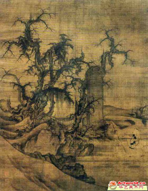 马远:宋代杰出画家。字遥父,号钦山。原籍河中(今山西永济县附近),侨寓钱塘(今浙江杭州)。南宋画院待诏。父世荣、伯父公显,兄逵,都是画院画家。初师李唐,能独辟蹊径,自成一家。他画树石等用郑虔的淡彩法,又颇类于巨然。下笔严正,用雄奇简红的笔法,水墨苍劲的大斧劈皴,以坚实、爽朗有力的浅染来描写江南雄伟壮丽的山川。兼画人物、花鸟,作人物有轩昂闲雅之气,与同时的夏 ,号称“马夏”。他善作平视或仰视的构图,用焦墨作树石,石皆方硬,危崖峭壁,水色交融。他画的《水图》表现了不同条件下江河湖海的运动状态,奇幻多姿。在构图方面,善于将复杂的景色给以高度的集中和概括。画山,常画山之一角,或“马半边”。对他简洁有力的构图,称为“边角之景”。他又多用水墨,画楼阁用“界画”;画树干瘦硬为屈铁,但刚健中有柔和。笔法豪放而谨严,变化多而融和。历代评画者评他是“水墨苍劲”的风格。现存画水的作品用各种轻重不同的笔法,把平远、迂回、盘旋、汹涌、激撞、跳跃,以及微风吹起的微波,月光反映的滟荡等水的动态,画得十分动人。他的花鸟画有《柳塘聚禽图》、《梅石溪凫图》。人物画有《女孝经图》等。还有《华灯侍宴图》、《寻滩双鹭图》、《四景图》、《对月图》、《寒江独钓图》、《踏歌图》、《秋江渔隐图》、《山径春行图》等。 copyright Artworld.cn