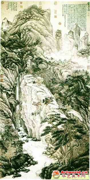 “元四家”,在明代中期认为是赵孟俯、黄公望、王蒙、吴镇四位画家,明末董其昌等人认为赵孟俯的地位应高一些。而换了倪瓒,明代王世贞《艺苑厄言》中说:“山水画至大、小李一变也,荆(浩)、关(仝)、董(源)、巨(然)又一变也,李成、范宽又一变也,刘(松年)、李(唐)、马(远)、夏(圭)又一变也,大痴、黄鹤又一变也。”元代画家,是变化中的中坚。 www.Artworld.cn