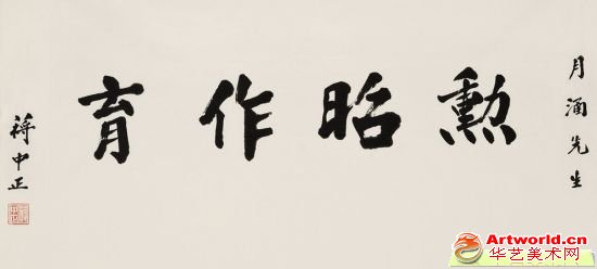 copyright Artworld.cn 《楷书“勋昭作育”》 本文来自华艺美术世界网 到过台湾清华大学“梅园”的人们应该都会对一面镌刻“勋昭作育”四个大字的碑墙记忆犹新。四字楷书极为庄正严肃,上款是“月涵先生千古”,下款是“蒋中正敬题”,均阴刻填金。观此,令人不禁缅怀起这位长校清华大学达31年、一手将其带入世界一流高等学府并打造其不朽校格、被两岸清华大学尊为“终身校长”的教育家的盖世功勋,也令人不禁艳羡当时的最高领袖对这位大教育家的高度赞赏。 内容来自A r t w o r l d . c n