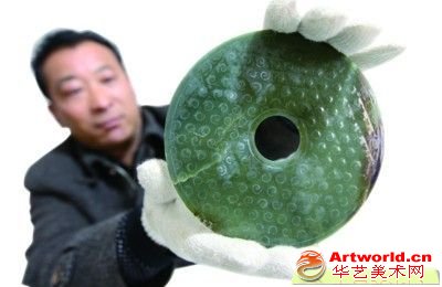 据悉,这块玉璧颜色青绿,上面刻有汉代典型的乳钉纹和云纹。直径15厘米左右的玉璧尽管沉睡地下2000年,但出土后依然色泽温润,迎着光线更是显得通透无比。考古人员说,根据玉质的硬度等指标判断,这是一块难得的和田玉璧。 “这块玉的硬度非常高,且非常通透,颜色好,水头也足,这些都符合和田玉的特质。是和田玉中的精品。 ” copyright Artworld.cn 考古工作者介绍,在汉代,玉器被广为推崇。古人不仅生时喜欢佩戴玉器,更有传说死后随葬玉器能“升仙”。而玉器的使用在古代也有严格限制,死后随葬玉璧说明这座墓的主人一定有非常尊贵的身份。 本文来自华艺美术世界网