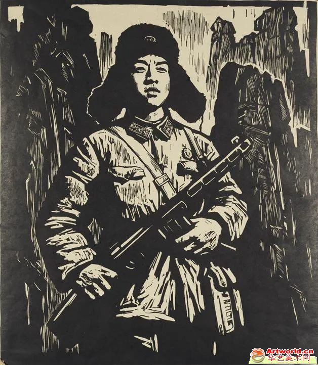 copyright Artworld.cn 吴强年生于1937年,是四川版画肖像刻画领域的佼佼者。他的画着力表现人物的思想性格与精神面貌,既有形象的概括力,又具有鲜明的个性特征。1963年3月5日,《人民日报》发表了毛泽东主席“向雷锋同志学习”的题词,全国上下迅速掀起学习雷锋、纪念雷锋、宣传雷锋的热潮。在这样的时代背景下,吴强年创作了《雷锋》。整幅画运用强烈的黑白对比和质朴有力的刀法,增强了视觉效果,背景中矗立的山峰岩石力求单纯有力,以凸显出一种纪念碑式的效果。再结合画面中心手持冲锋枪的英雄形象,给人以社会主义祖国千秋万代和雷锋精神永世流传的联想。该作品完成后,曾先后在《人民日报》《光明日报》《四川文学》等多家重要刊物发表,成为表现雷锋的经典艺术形象。(撰文:高晴) 中国星翁艺苑 内容来自A r t w o r l d . c n